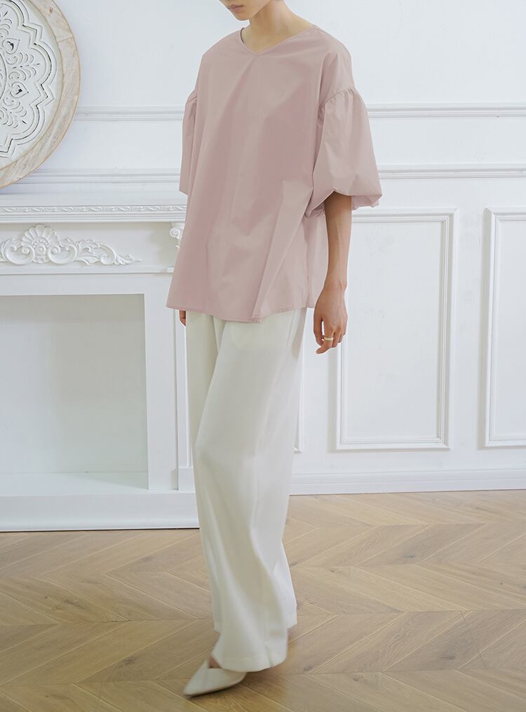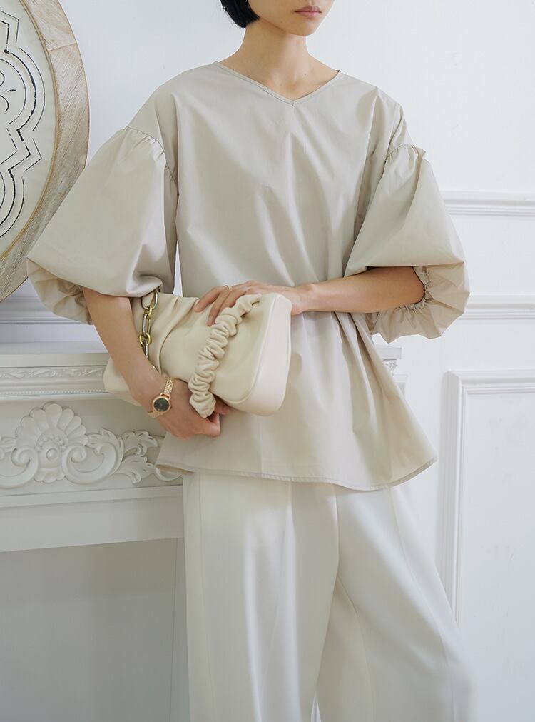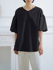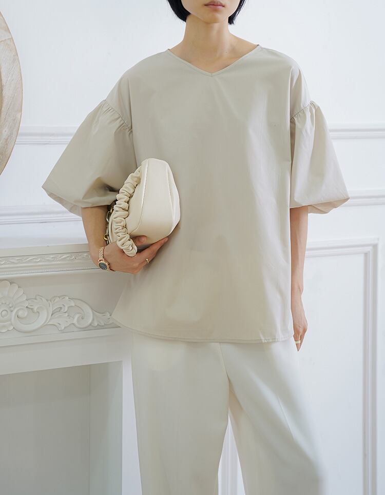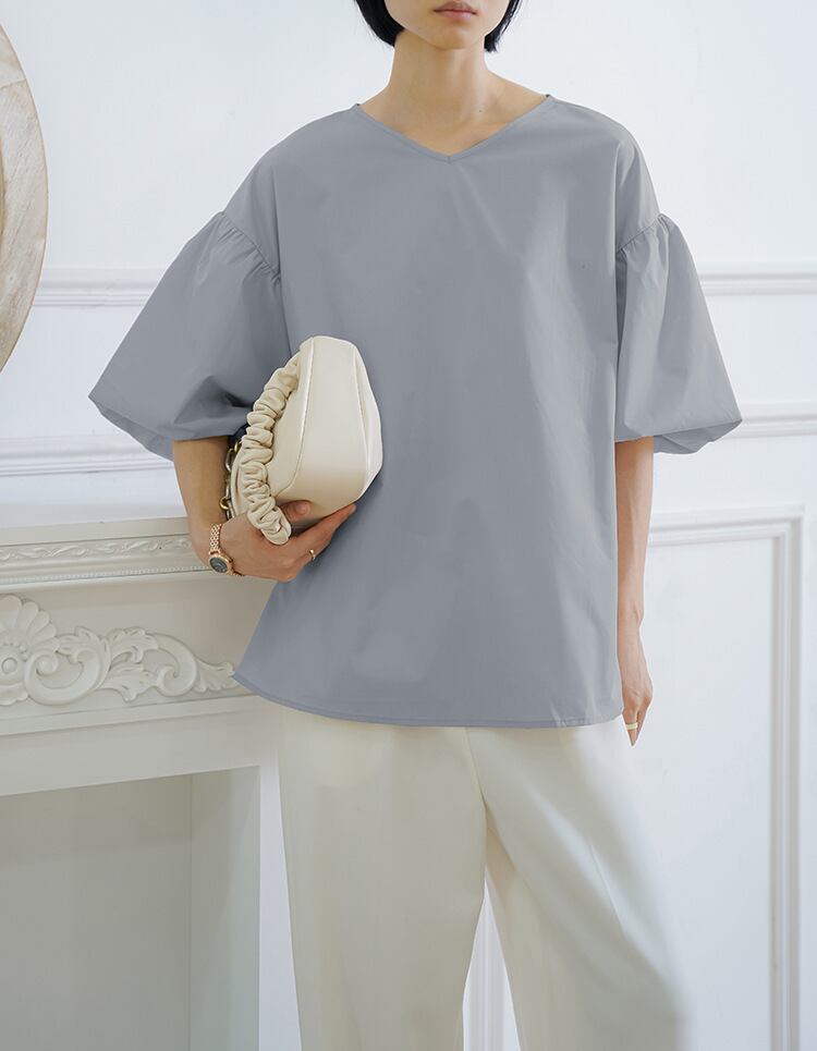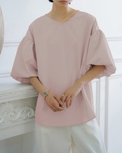 Vネックシャツ ブラウス バルーンスリーブ 五分袖 バックリボン フェミニン ぽわん袖 ベージュ ホワイト ブラック コーラルピンク ブルーグレー 大きいサイズ 着やせ 体型カバー バックスリット