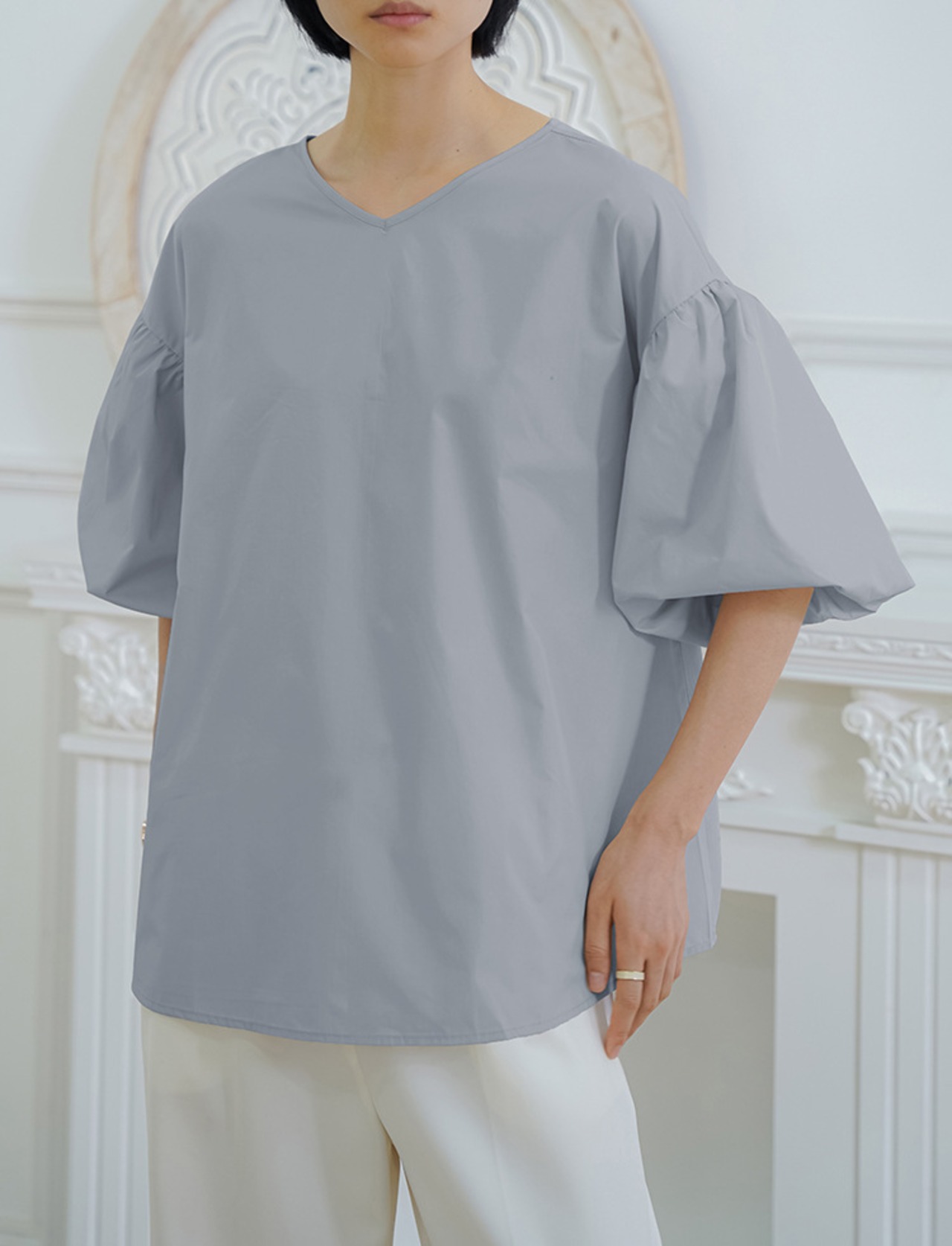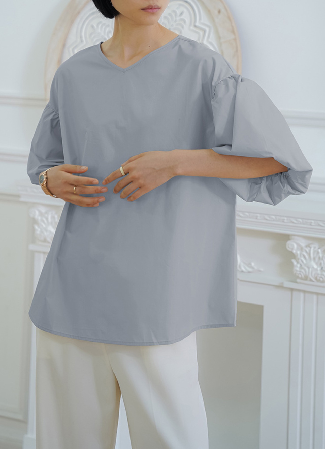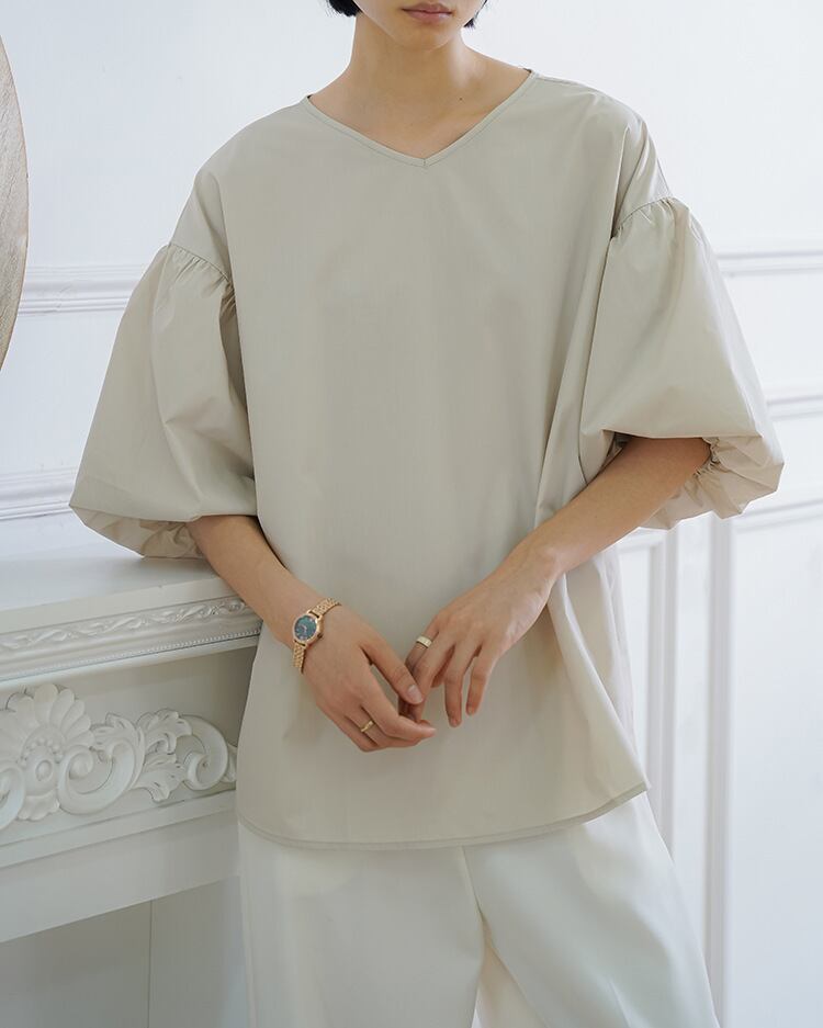 Vネックで顔まわりもスッキリ。