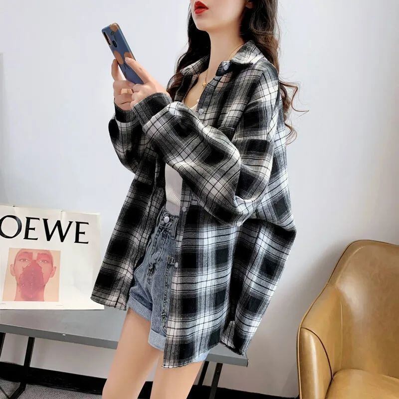 黒チェック柄 長袖シャツ オーバーサイズ カジュアル 大きいサイズ 着やせ 体型カバー 羽織り 秋冬 ブラック×ホワイト