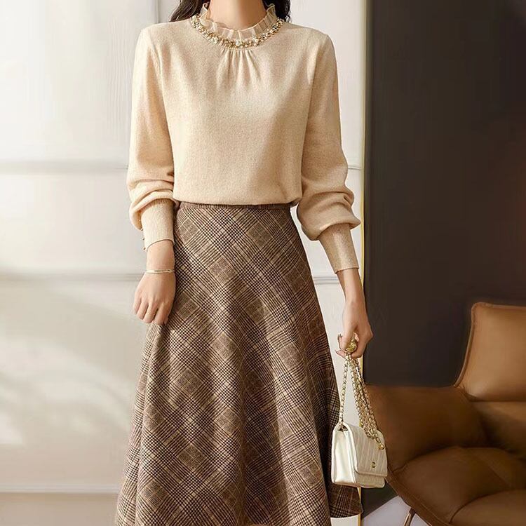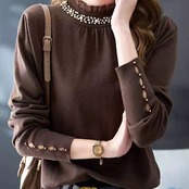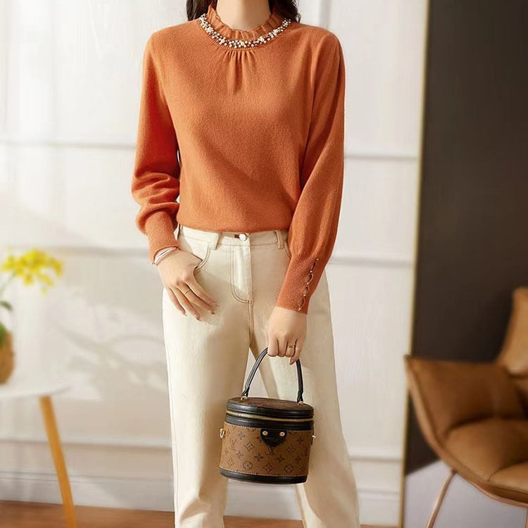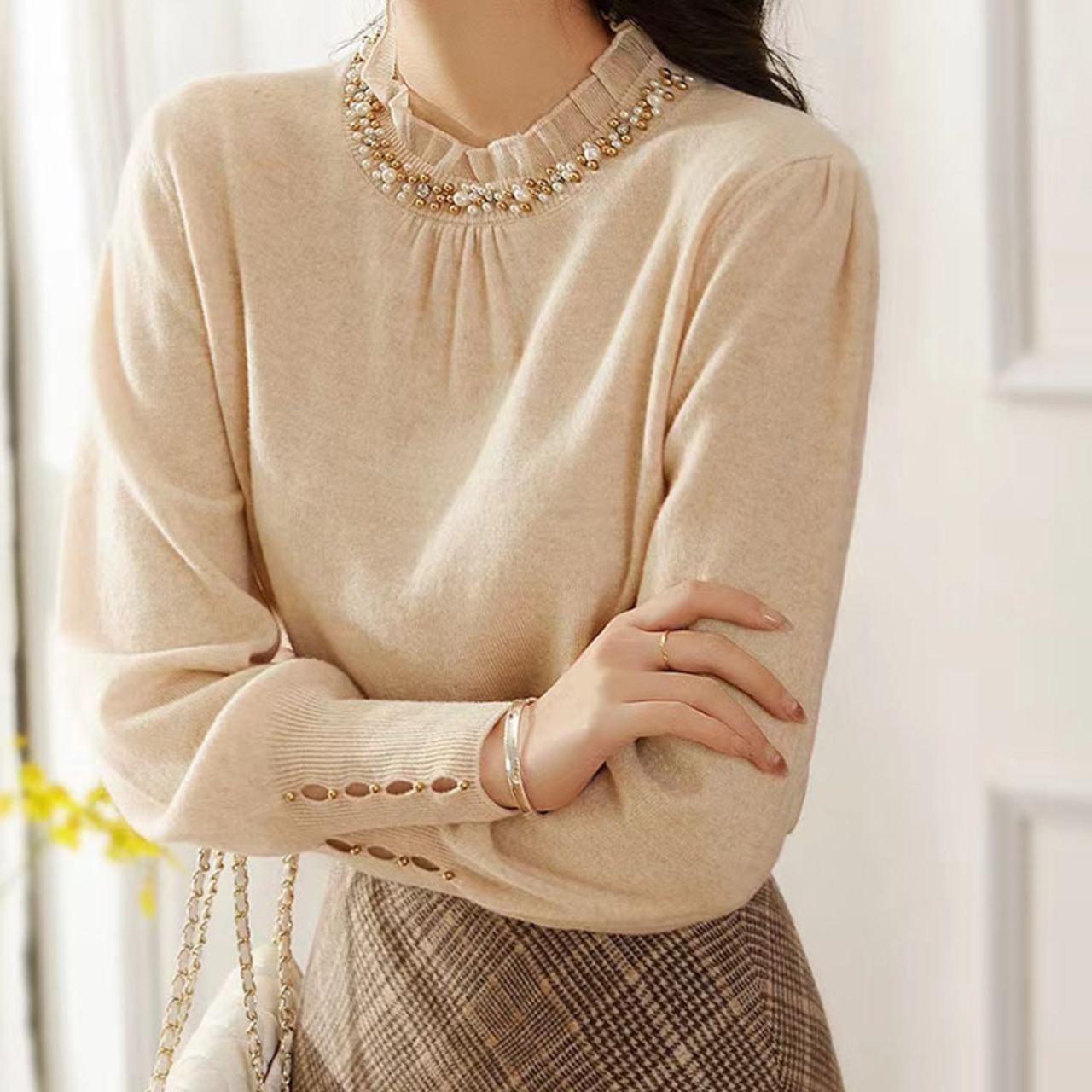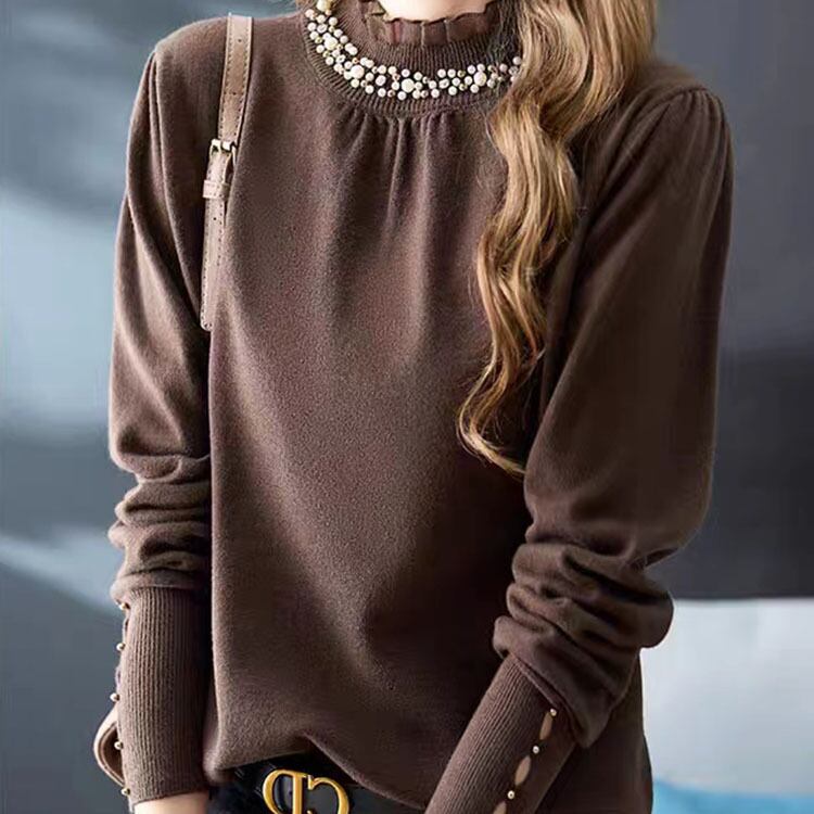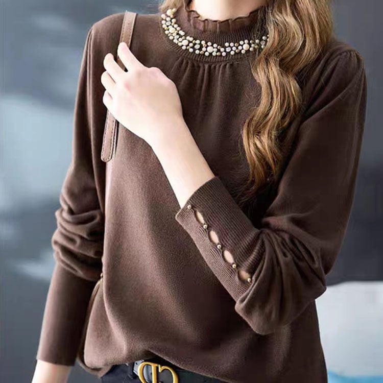長袖ニット ビジュー レース エレガント 華やか ブラウン ブラック ベージュ オレンジ トップス ハイネック キレイ 上品 通勤 デート お出かけ シルエット ビーズ