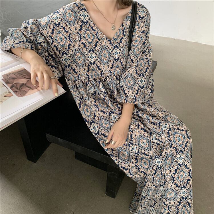 どんなシーンでもおしゃれに決まるレトロ柄のロングワンピースが登場!ふんわりとした七分袖で女性らしい雰囲気を演出。カラーは2種類から選べます。リラックス感のあるシルエットで、体型を気にせずに着こなせます。春から秋まで長く着用できるアイテムです。
