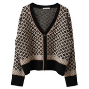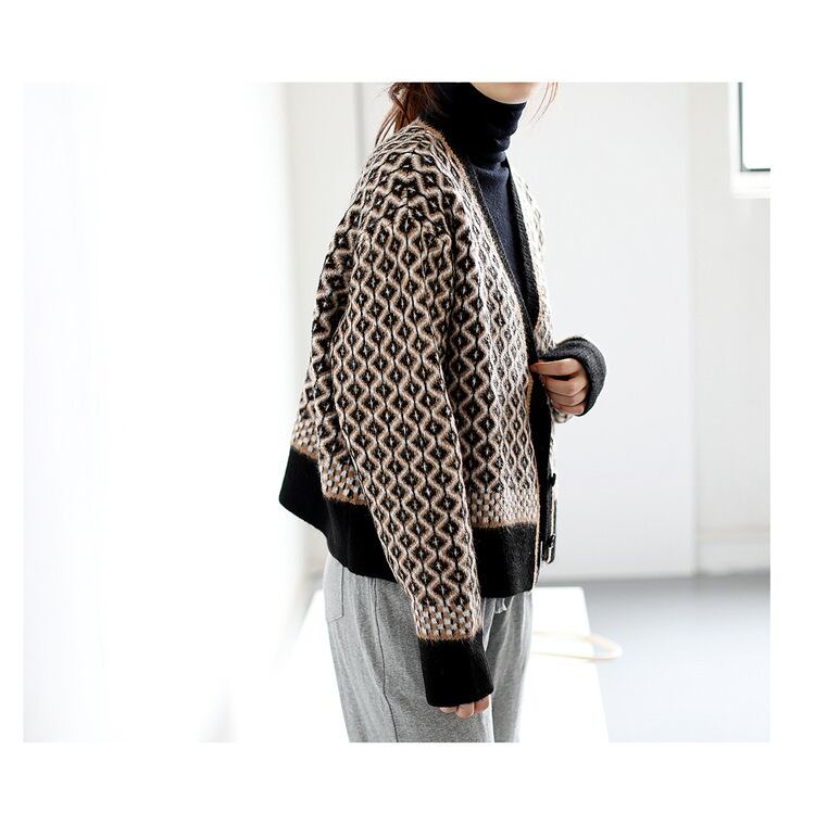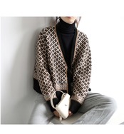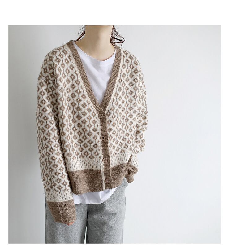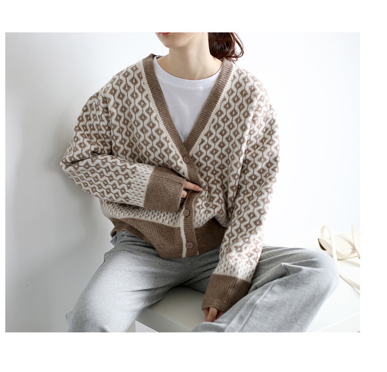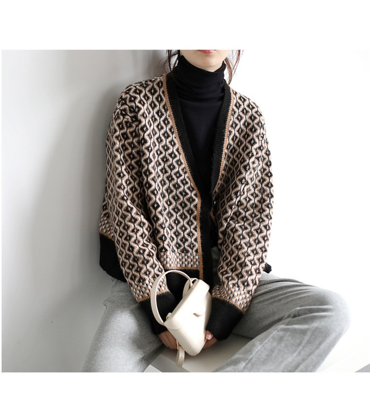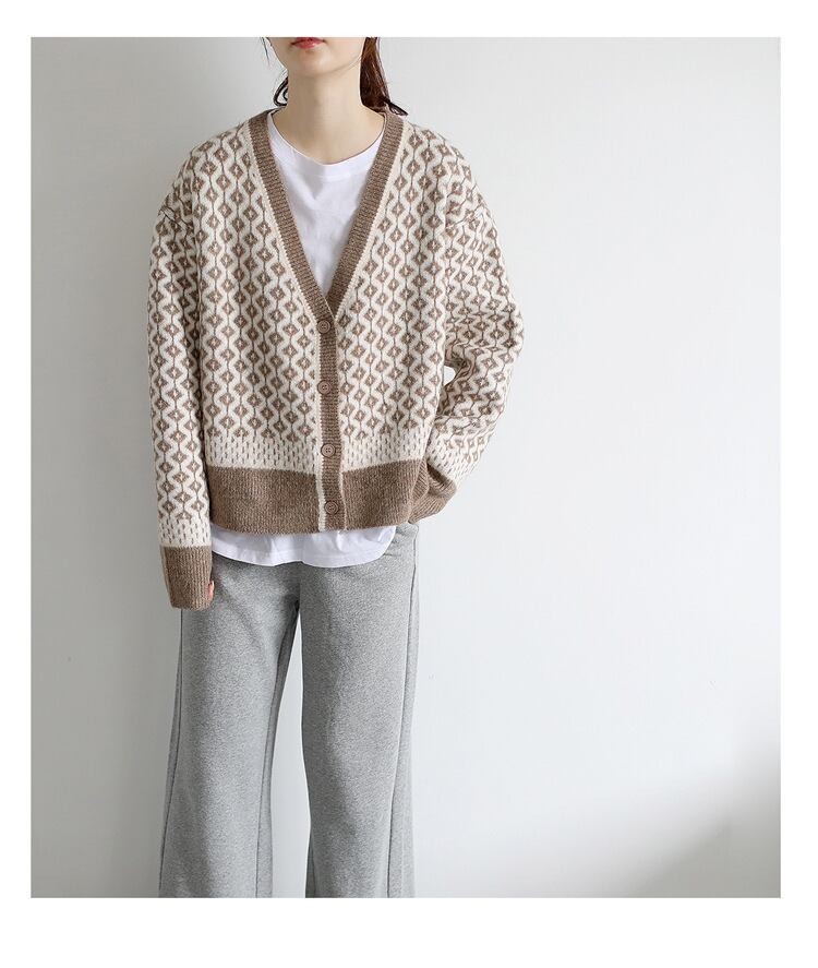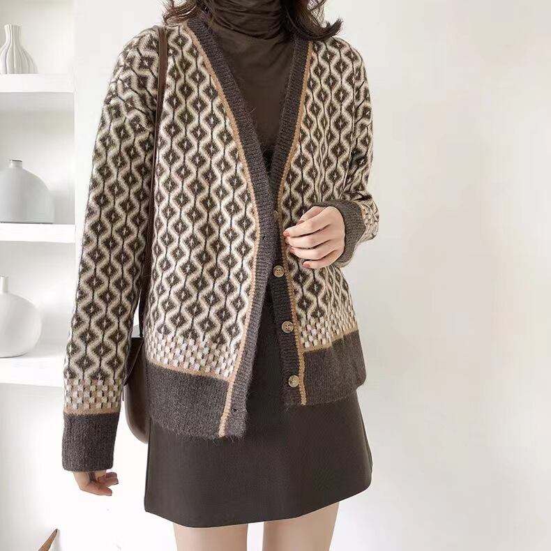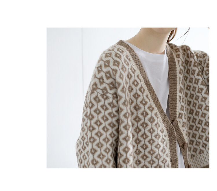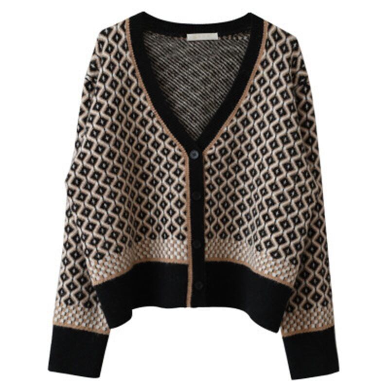 ニット Vネックカーディガン ダイヤモンド柄 ブラック ライトブラウン ダークブラウン 羽織り 長袖 秋冬 フェミニン カジュアル