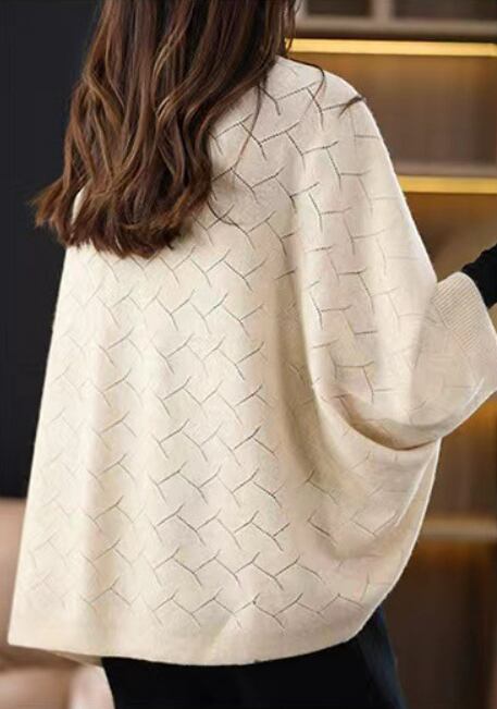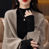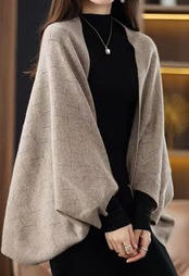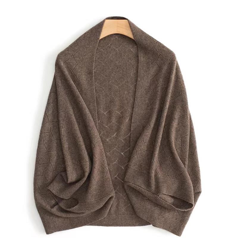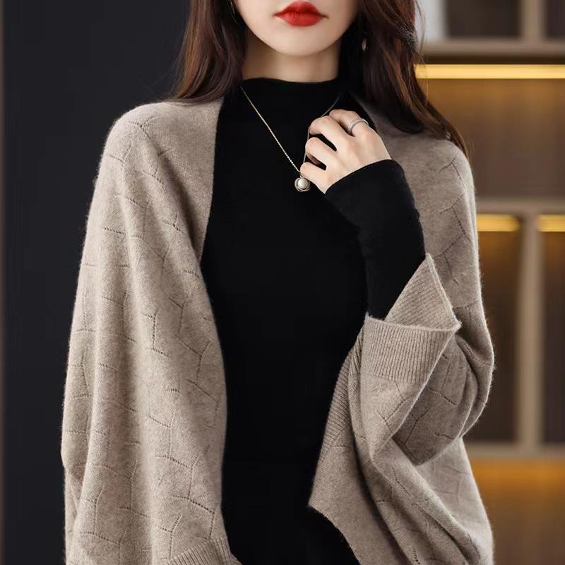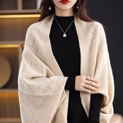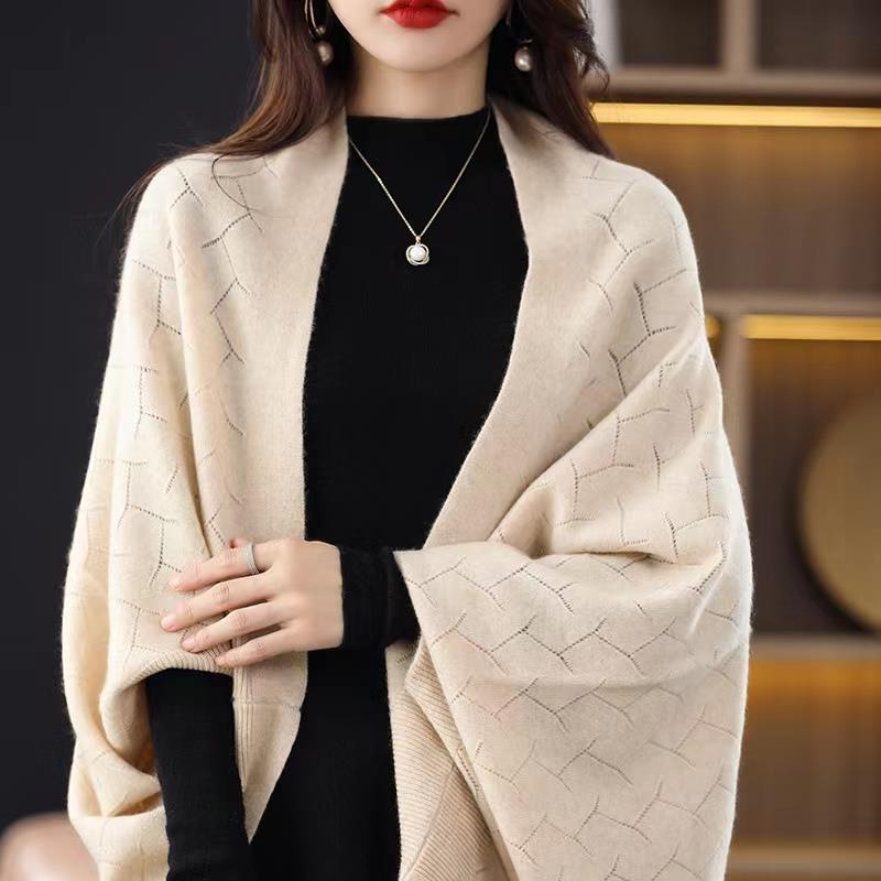 羽織るだけで上品なコーディネートのできあがり。透かし編みのダイヤモンド柄がフェミニンなニットカーディガンのショールは、とても便利なアイテムです。