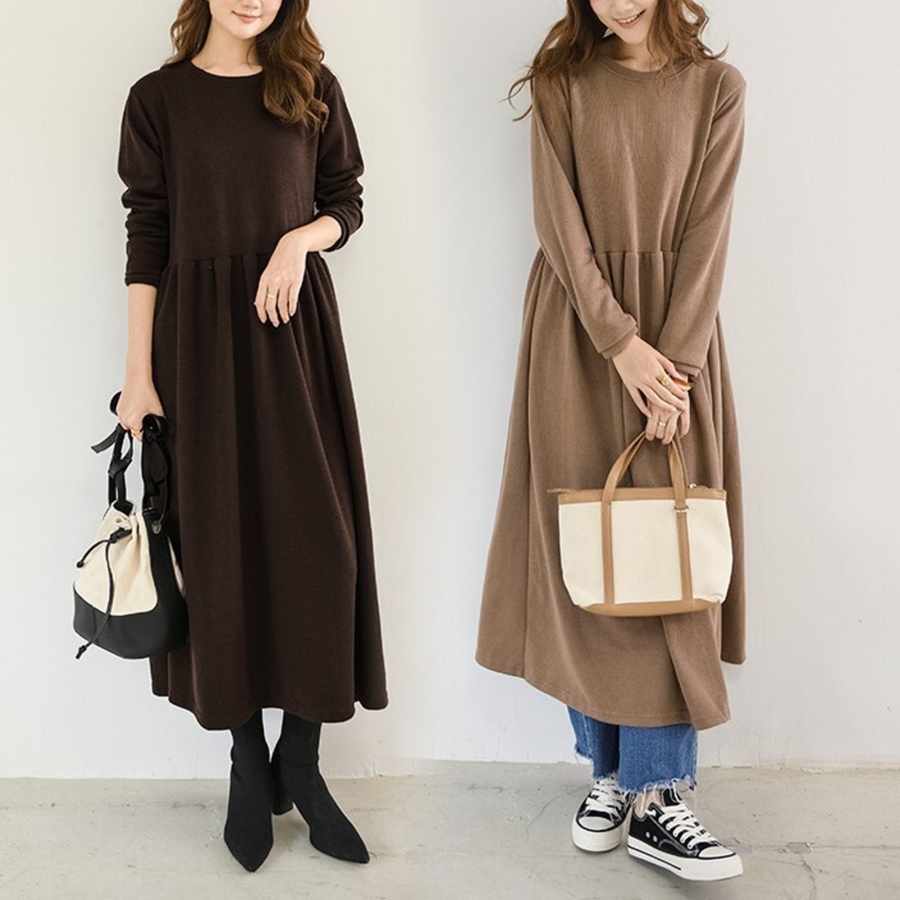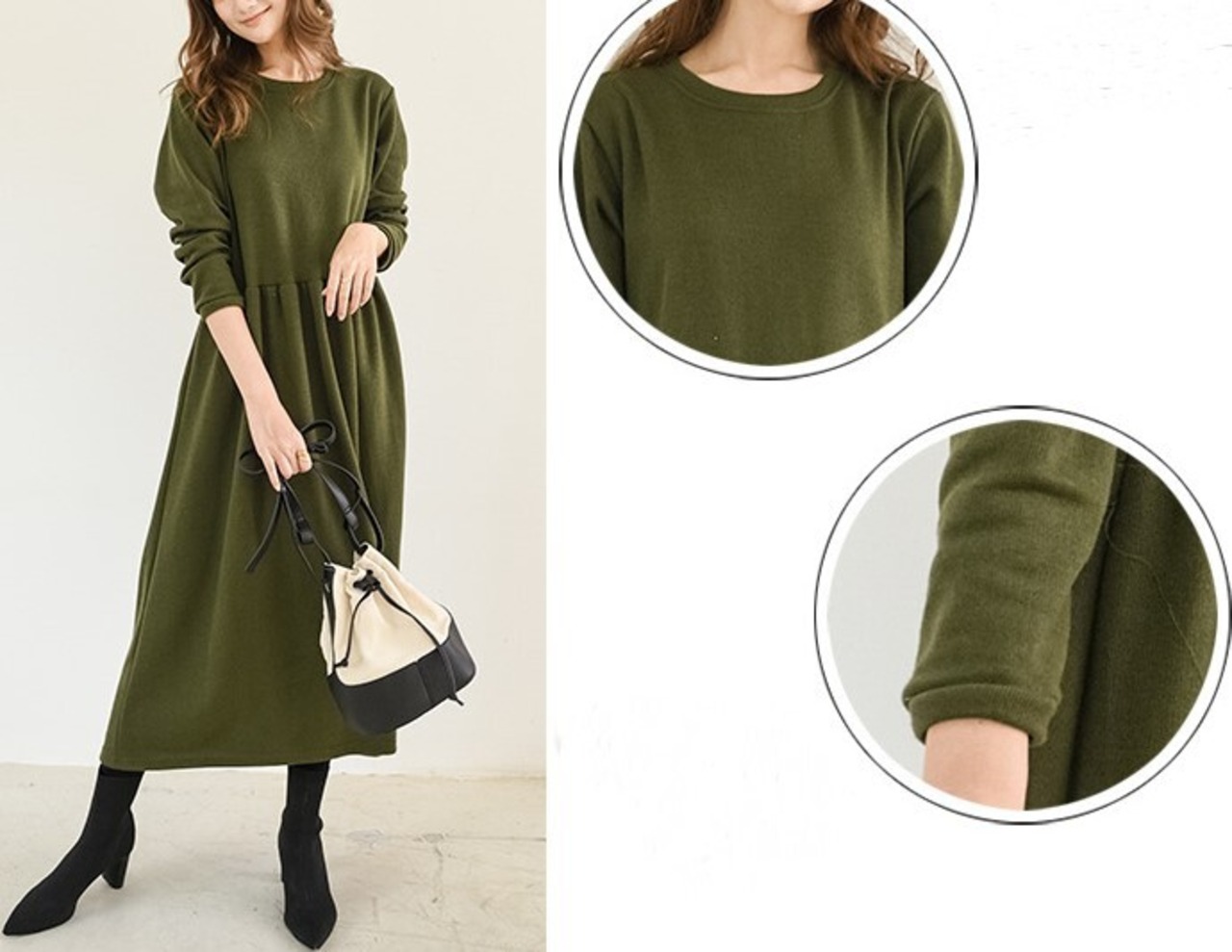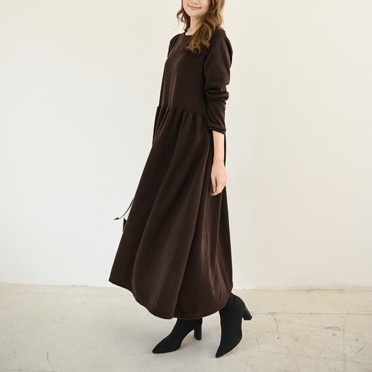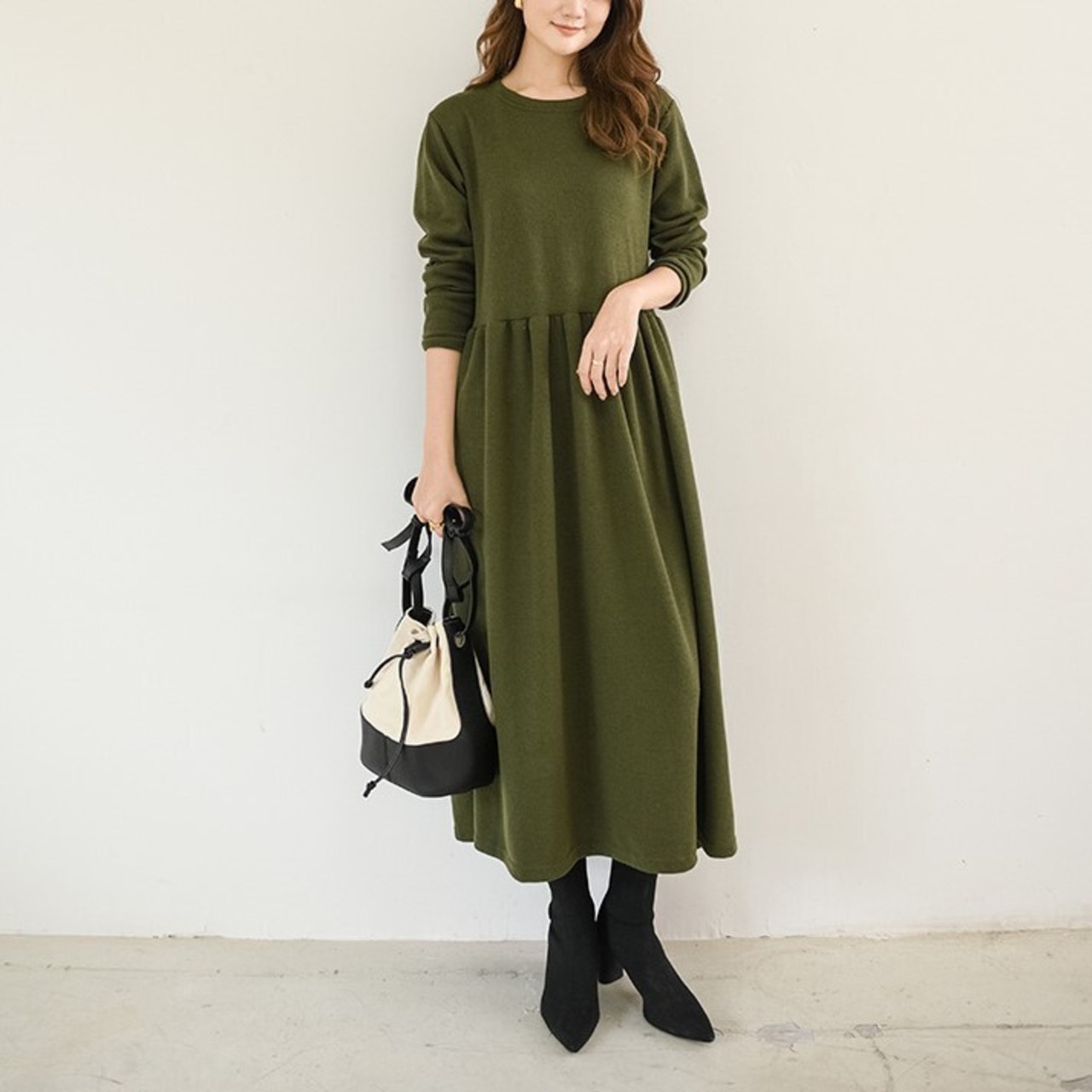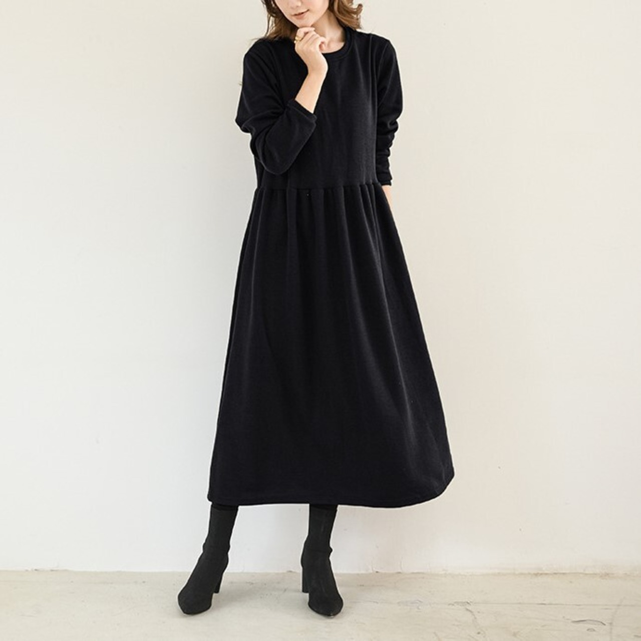 1枚で今年っぽいコーディネートを演出してくれる長袖ワンピースです。クルーネックで首回りスッキリ。ロング丈で気になる体型をすっぽりカバーしてくれるのが嬉しい!