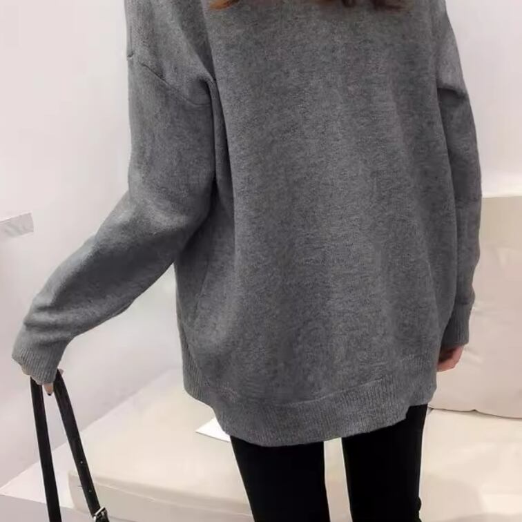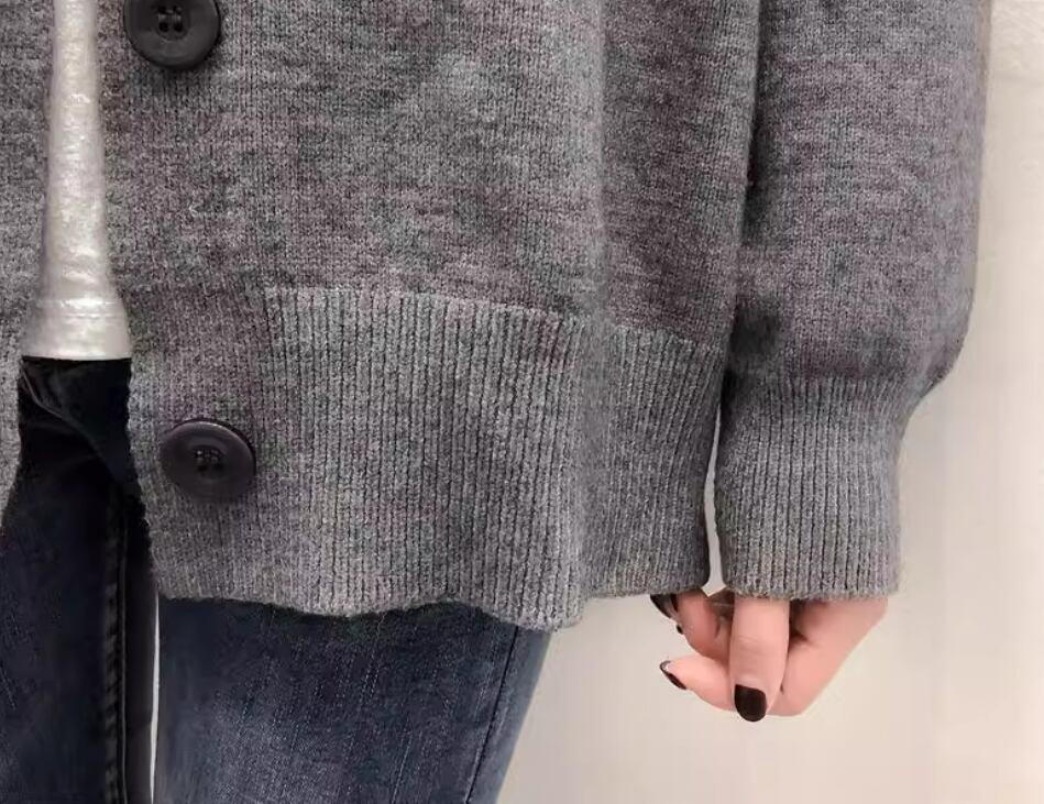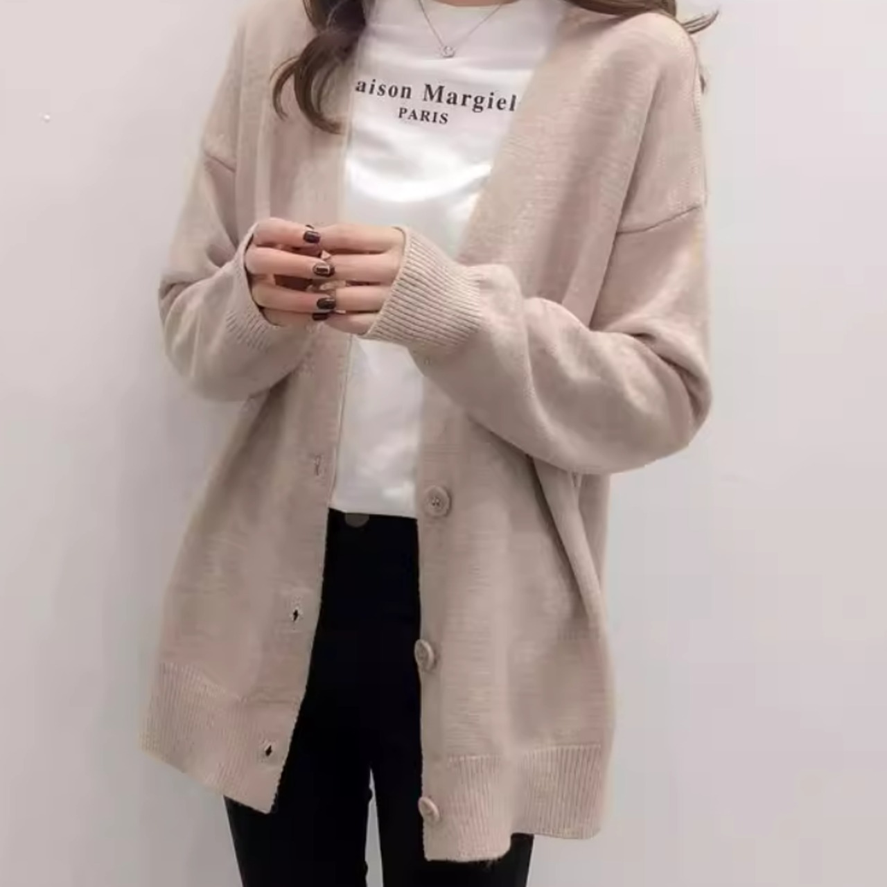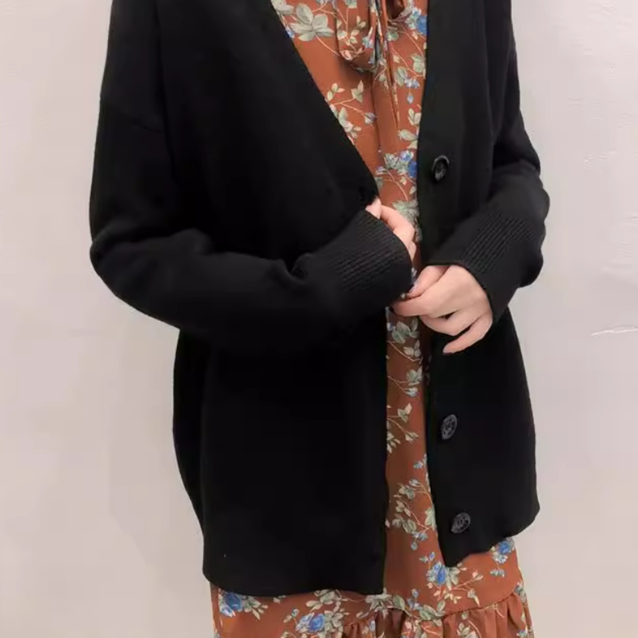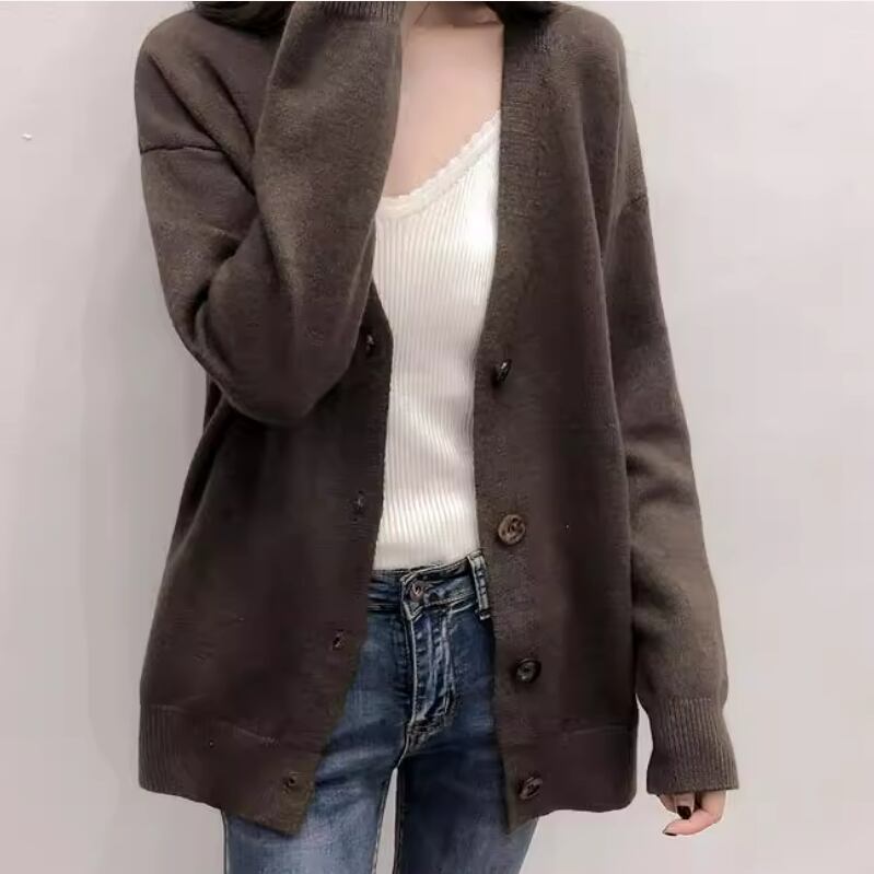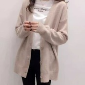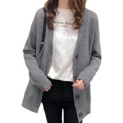 シンプルなデザインだから合わせやすいニットカーディガンです。大きめサイズでヒップもかくれて、すっきりシルエット。色違いで揃えたいアイテムです。