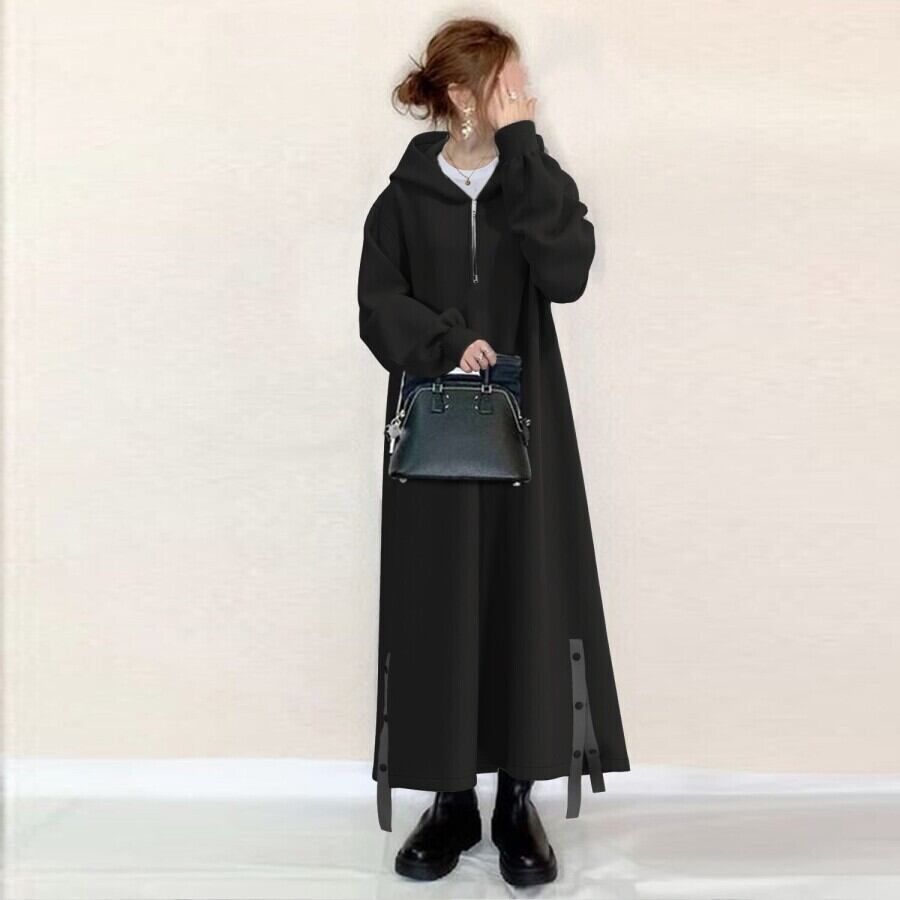 ワンピース レディース 長袖 フード付き スウェット 無地 ルーズ ドレス ジッパー ブラック ロングワンピース 着やせ 体型カバー 秋冬服 大きいサイズ ゆったり カジュアル キレイめ