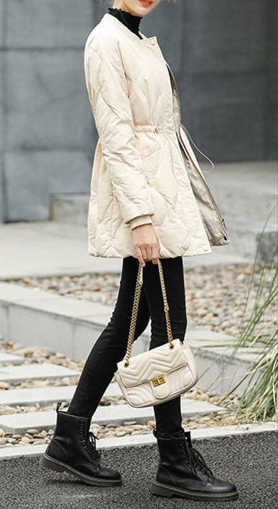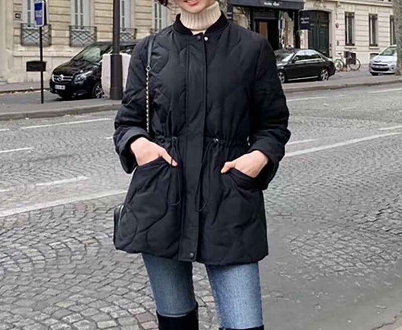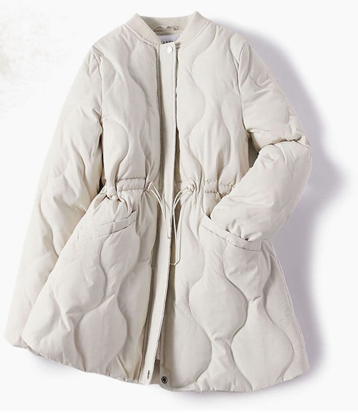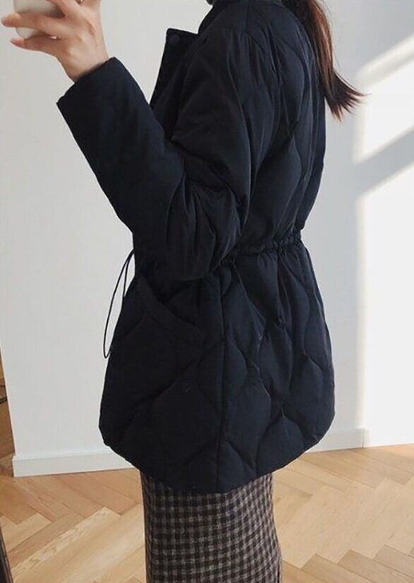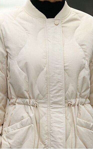 ダウンジャケット レディース ミディアム丈 薄い 軽量 ハーフ丈 エリなし フードなし ダウン コート 冬 ジャケット ウエストマーク ポケット スタイルアップ 着やせ ジャンパー ホワイト ブラック 中綿 無地