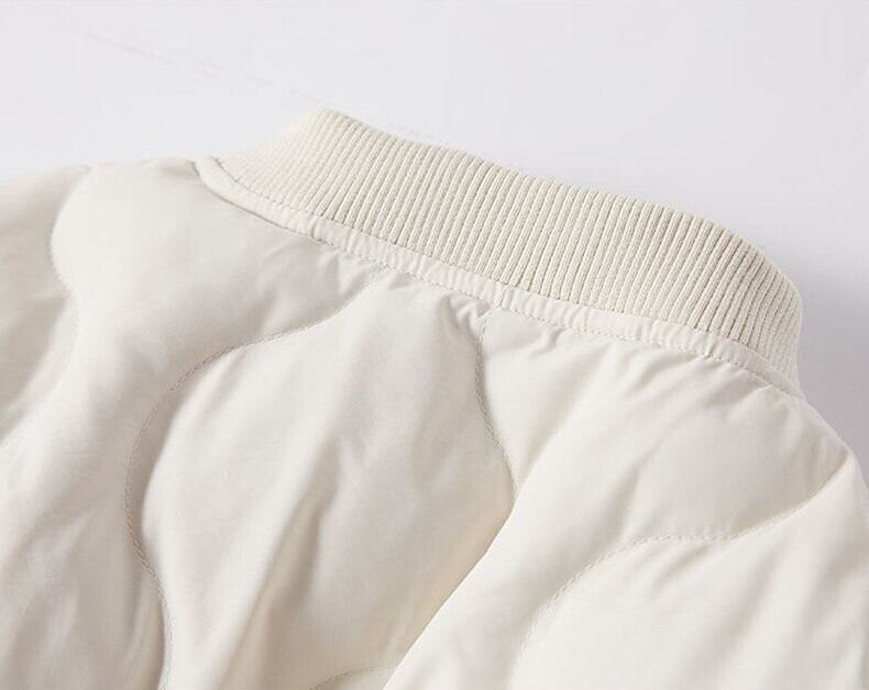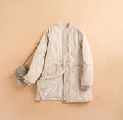 薄くて軽いダウン風ジャケットです。ウエストマークとヒップのかくれる長さで、気になる部分をカバー。スタイルアップ効果抜群です。えりやフードがないので、首元がすっきりしていて、お気に入りのストールが巻きやすいのも嬉しいです。