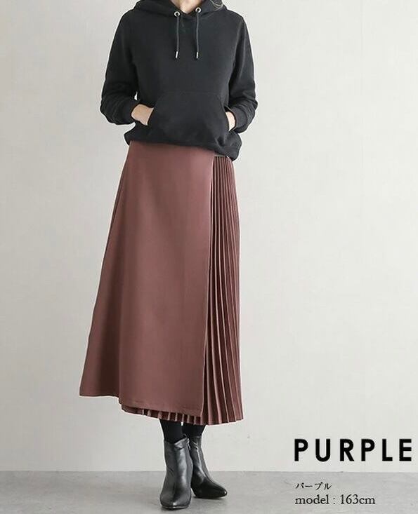 ロングスカート 巻きスカート サイド プリーツ Aラインスカート ひざ下 きれいめ カジュアル 上品 お出かけ 通勤 オフィス 30代 40代 50代 ネイビー パープル ブラック ブラウン ベージュ アシンメトリー