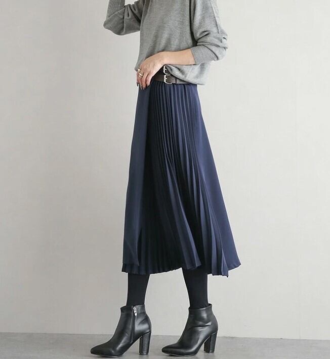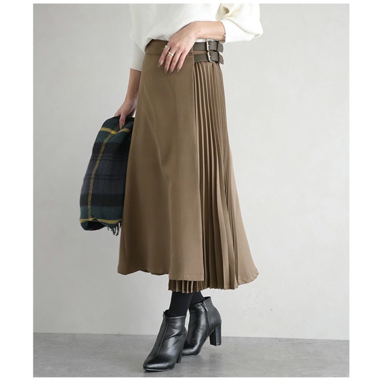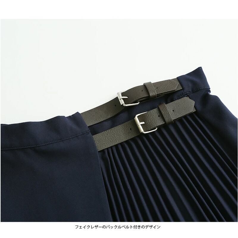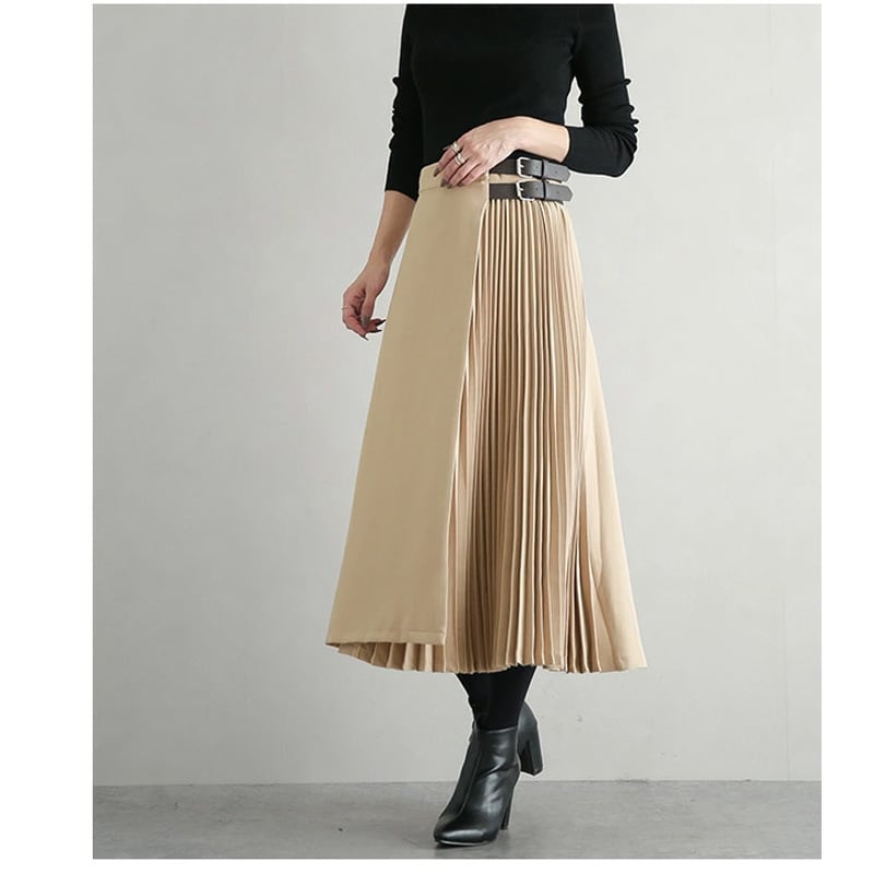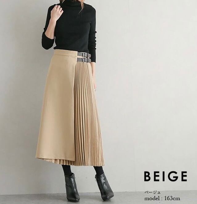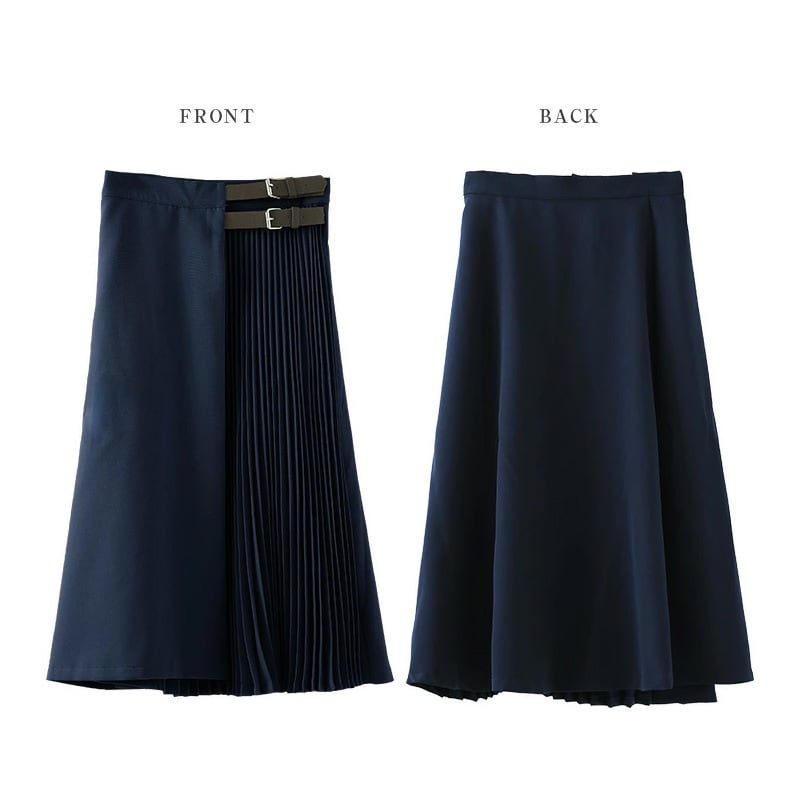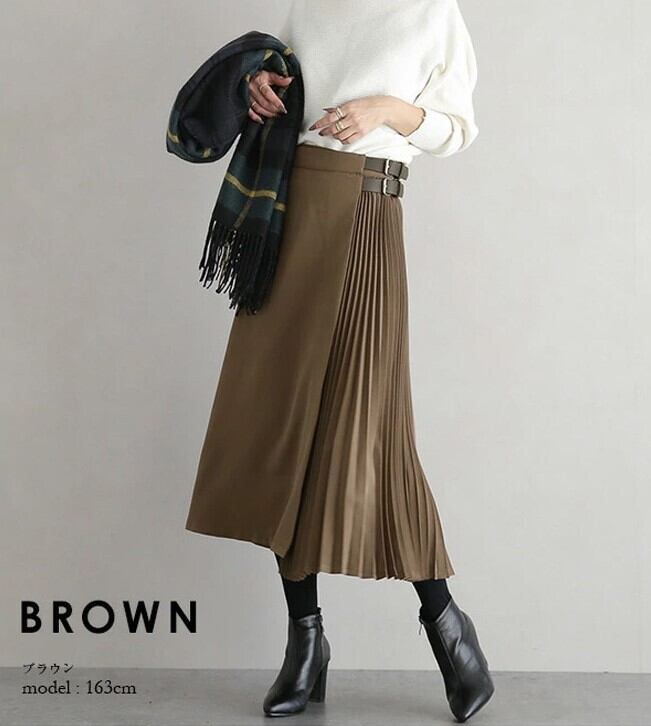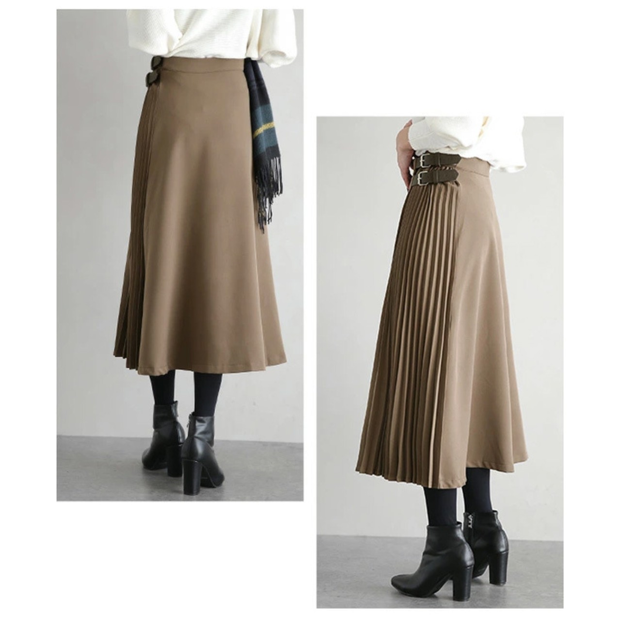 細やかなプリーツ巻きスカートです。すっきりしたAラインスカートで着やせ効果抜群。フェイクレザーのバックルデザインがオシャレ。カジュアルなデイリーにもオフィスやお出かけなどきれいめにもコーディネートの幅が広がります。